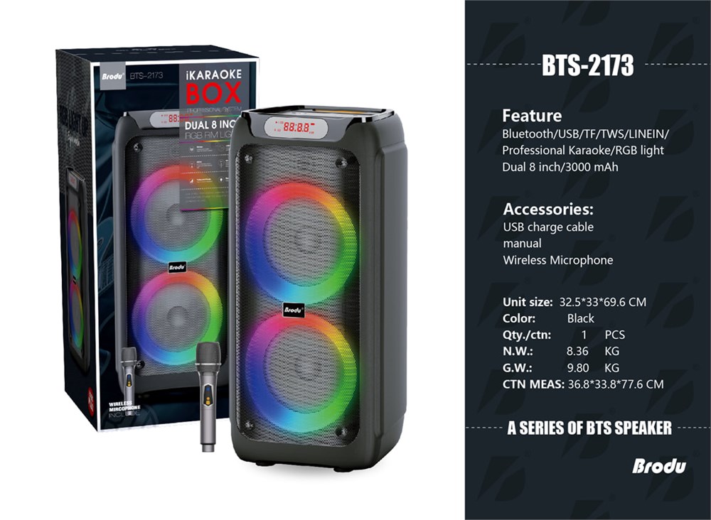 BTS-2173 — это мощная Bluetooth колонка с караоке формата iKaraoke Box, оснащённая двумя 8-дюймовыми динамиками и твитером. Отлично подойдёт тем, кто ищет громкую портативную колонку для вечеринок, дома или дачи, с насыщенным звуком и эффектной RGB-подсветкой.