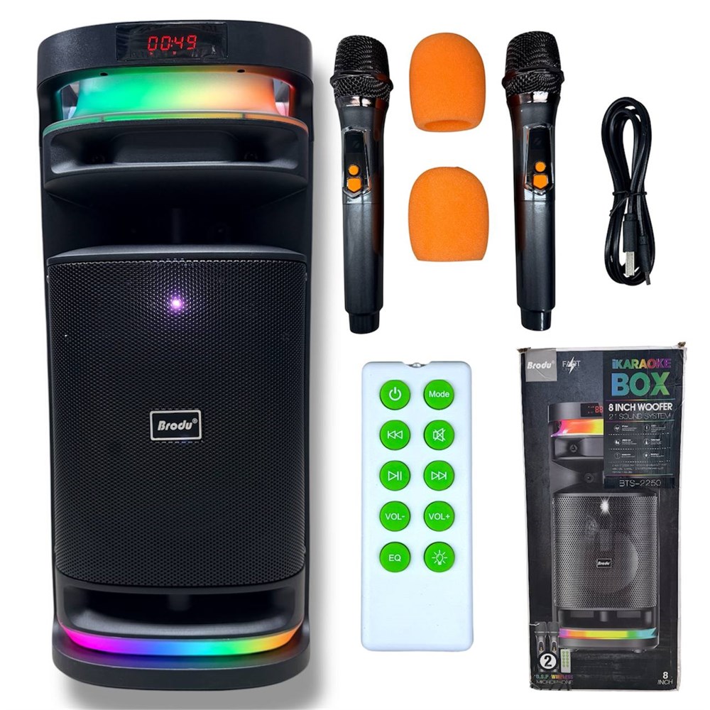 Brodu BTS-2250 — это большая портативная Bluetooth колонка с караоке, созданная для вечеринок, дома, дачи и мероприятий. Громкий чистый звук, насыщенный бас, RGB-подсветка и комплект беспроводных микрофонов делают её полноценным караоке-центром «всё в одном».